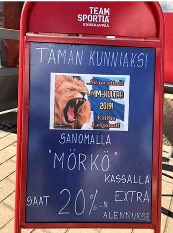 Esimerkiksi kauneusalalla innostuttiin MM-kullasta. KaunisKeijun ihonhoitokonsultti Ida Kareinen tarjosi Mörkö-kasvonaamiota hauskalla tekstillä: ” Ensin hävisi Ruotsi, sitten Venäjä ja Kanada. Ja nyt häviää epäpuhtaudet. Linnails puolestaan esitteli sinivalkoista kynsitaidetta Mörkö-kynsillä, kultamitalilla ja siniristilipulla.