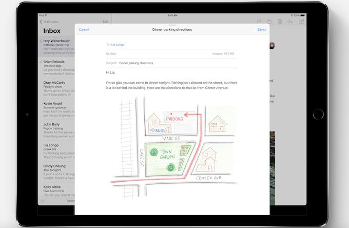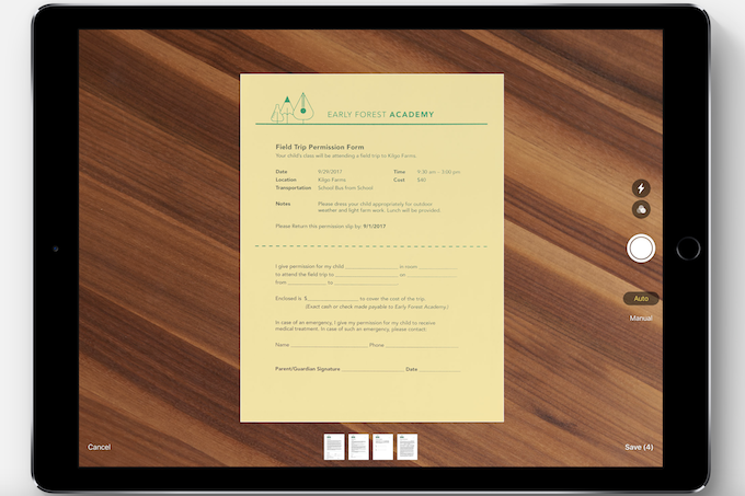 Työskentelyä iPadilla helpottaa Notes-sovelluksen toiminto, joka toimii asiakirjaskannerina. Kun asiakirjasta on otettu kuva laitteen kameralla, se avautuu muokattavaksi stylus-kynällä. Käyttäjä voi esimerkiksi allekirjoittaa asiakirjan ja lähettää sen eteenpäin. Dokumentteihin voi lisätä myös piirroksia tai käsialatekstiä. Esimerkiksi sähköpostikentässä sovellus osaa rivittää tekstin automaattisesti piirroksen reunoille.