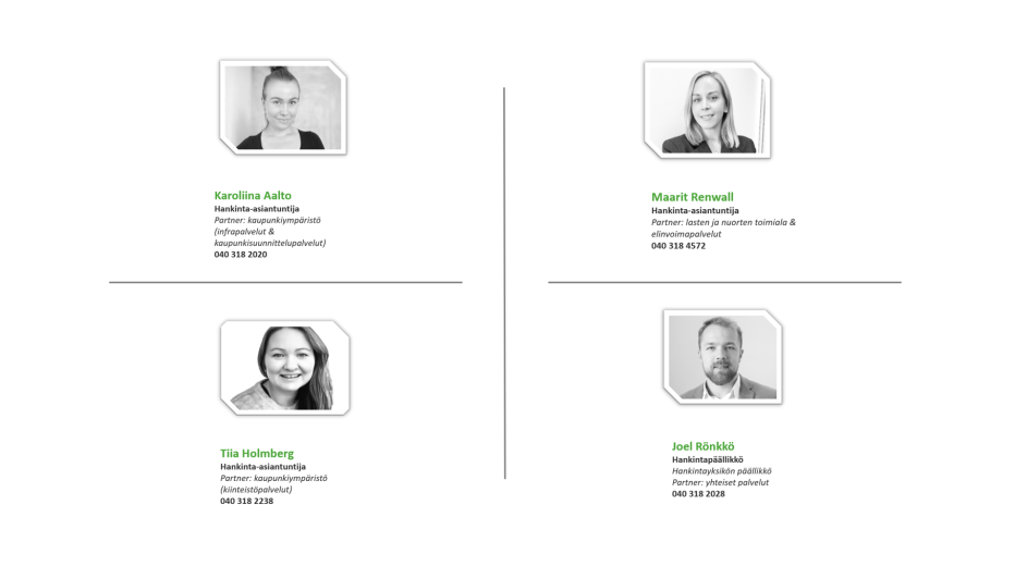 Hankintapalvelut takaavat tehokkaat ja läpinäkyvät hankinnat kaupungin strategian mukaisesti. Tiimi kilpailuttaa suuret hankinnat, tukee pienhankinnoissa, järjestää koulutuksia ja hallinnoi yhteishankintasopimuksia.