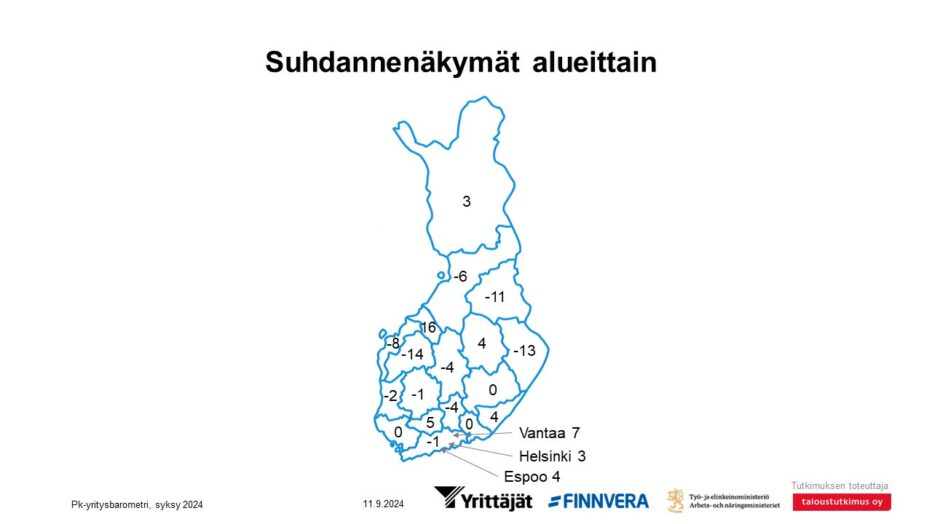 Kannattavuuden suhdeluku on noussut keväästä -7 %, ollen nyt vain -1 %. Koko maan saldoluku on myös muuttunut hieman positiivisemmaksi ollen nyt -9 %, kun keväällä suhdeluku oli vielä -11 %.