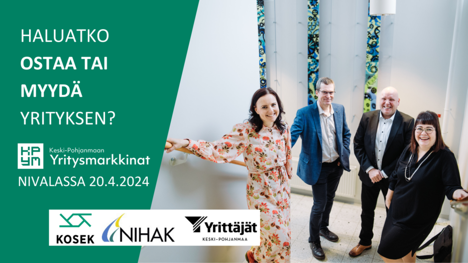 Keski-Pohjanmaan Yritysmarkkinat kokoaa yhteen yrityksen ostoa tai myyntiä suunnittelevat lauantaina 20.4.2024. NIHAKin, Kokkolan seudun kehityksen (KOSEK) ja Keski-Pohjanmaan Yrittäjien yhteistyössä järjestämä tapahtuma tuodaan nyt ensimmäistä kertaa Nivalaan.