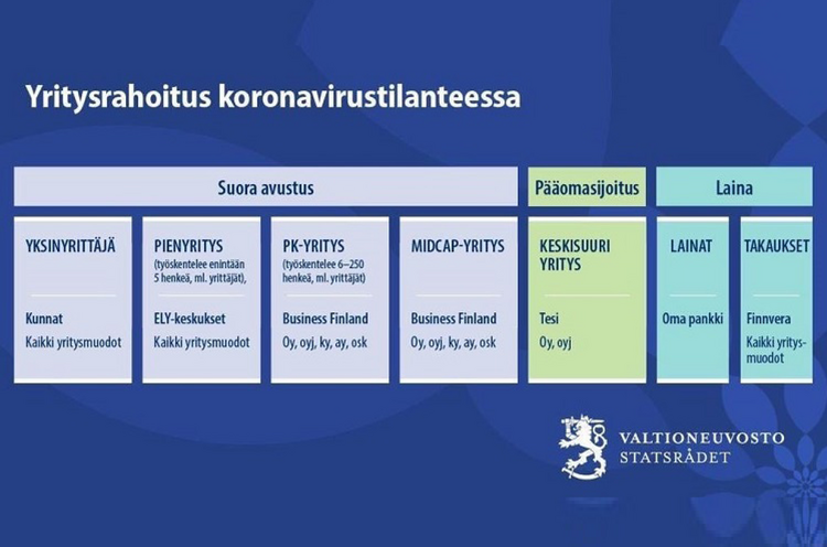 Yksinyrittäjä voi hakea kunnalta 2000 euron tukea koronavirustilanteessa. Tukiin on varattu 100 miljoonaa euroa. Ely-keskukset puolestaan tukevat 1–5 työntekijän pienyrityksiä. Näihin tukiin on varattu 200 miljoonaa euroa.