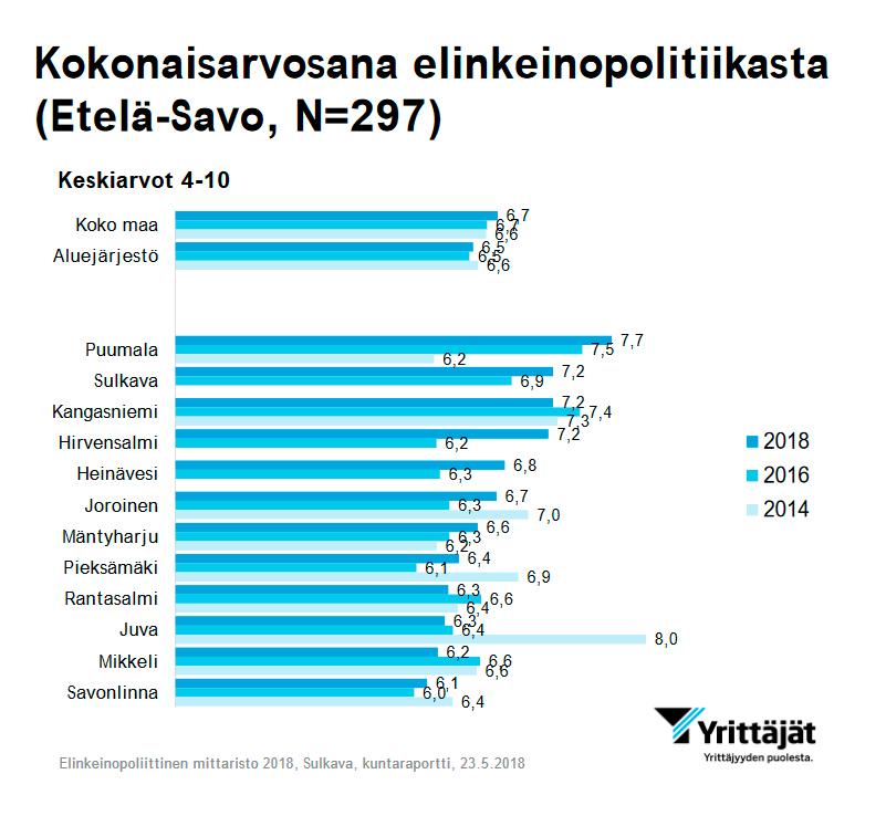Sulkavan Yrittäjät kutsuivat Sulkavan kunnanhallituksen yhteiseen iltaan keskustelemaan joka toinen vuosi järjestettävän Elinkeinopoliittinen mittaristo (ELPO) -kyselyn tuloksista. Etelä-Savossa Sulkavan kunta sijoittui toiseksi heti Puumalan jälkeen keskiarvolla 7,2 (v. 2016 6,9). Asteikkona käytettiin kouluarvosanoja 4-10. Allaolevasta linkistä voit ladata kyselyn tulokset Sulkavan kunnan osalta. Tulokset esitetään pääosin prosentteina.