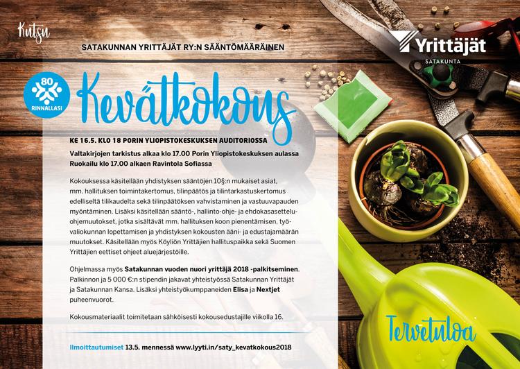 Satakunnan Yrittäjien kevätkokous ke 16.5. klo 17.00 alkaen. Valtakirjojen tarkistus ja ruokailu klo 17.00 alkaen, kokous aloitetaan klo 18.00. Kevätkokouksen yhteydessä palkitaan Satakunnan vuoden nuori yrittäjä 2018.
