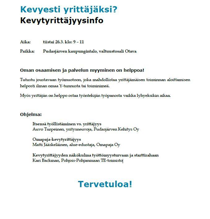 28.2.2019 klo 14:47 Uutinen #yrittäjänarki Kevyesti yrittäjäksi? Kevytyrittäjyysinfo Pudasjärven kaupungintalolla 26.3 Tämä teksti on konekäännetty. Jaa Kopioitu leikepöydälle