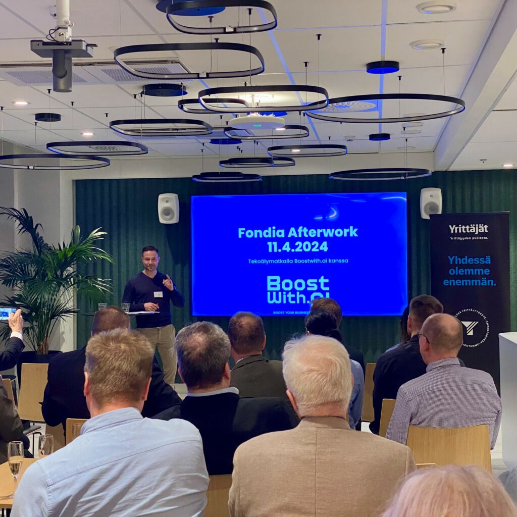 Afterworkien varsinaiseksi asiateemaksi oli valikoitunut ajankohtainen ja kaikkien huulilla tai ainakin silmissä vilisevä ja korviin kantautuva kirjainyhdistelmä AI. Illan aikana kuultiin innostava ja kannustava tarina Boostwith.ai:n tekoälymatkasta Heikki Lehmuskosken kertomana.