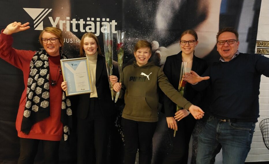 Pääkuvassa vasemmalta: Petra Paldanius (Kirkkonummen Yrittäjät ry, varapuheenjohtaja), Katri Kovanen, Lauri Kapanen, Emma Hakanen ja Janne Laitinen (Kirkkonummen Yrittäjät ry, puheenjohtaja)