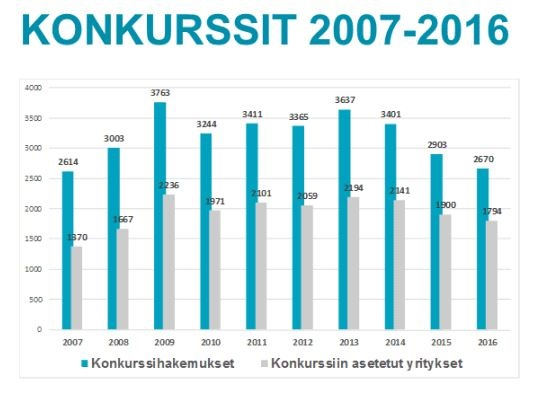 Verottajan osuus kaikista konkurssihakemuksista on pitkällä aikavälillä ollut noin puolet. Asiakastiedon tilastojen mukaan koko vuonna 2016 konkurssihakemuksia tehtiin yhteensä 2670. Hakemusten määrä väheni edellisvuodesta 8 prosentilla.