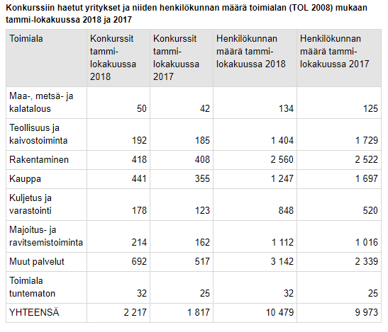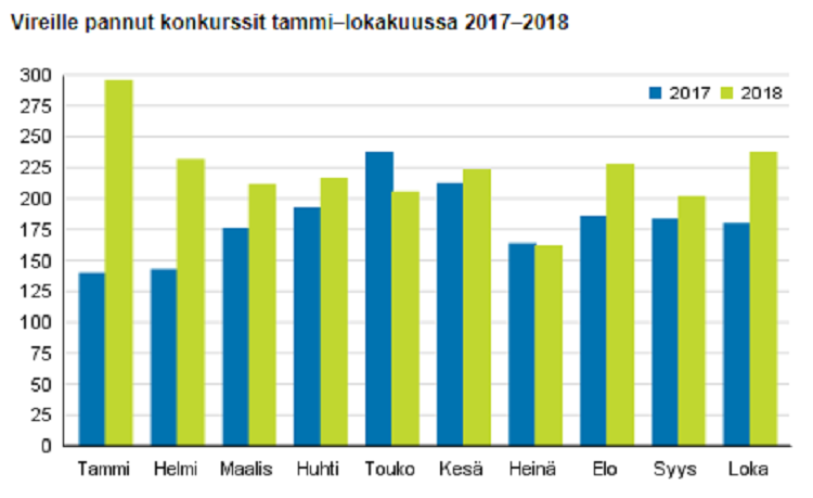 Tilastokeskuksen tietojen mukaan tammi–lokakuussa 2018 pantiin vireille 2 217 konkurssia, mikä on 400 konkurssia (22%) enemmän kuin vastaavana ajankohtana vuotta aiemmin.