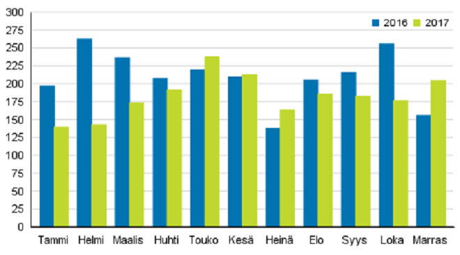 Tilastokeskuksen tietojen mukaan tammi–marraskuussa 2017 pantiin vireille 2 015 konkurssia, mikä on 292 konkurssia (12,7 prosenttia) vähemmän kuin vastaavana ajankohtana vuotta aiemmin. Henkilökunnan määrä konkurssiin haetuissa yrityksissä oli kaikkiaan 11 157, mikä on 481 henkilöä (4,1 prosenttia) vähemmän kuin edellisvuonna.