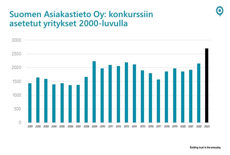 – Tämän vuoden loppuun mennessä konkurssiin tullaan asettamaan yli 2 700 yritystä. Tällä vuosituhannella on varsin harvoin menty edes kahden tuhannen konkurssin yli, joten vuosi 2023 valitettavasti näyttää ennätyksellisen heikolta, Asiakastiedon konkursseihin perehtynyt tuoteomistaja Jaakko Nors kertoo.