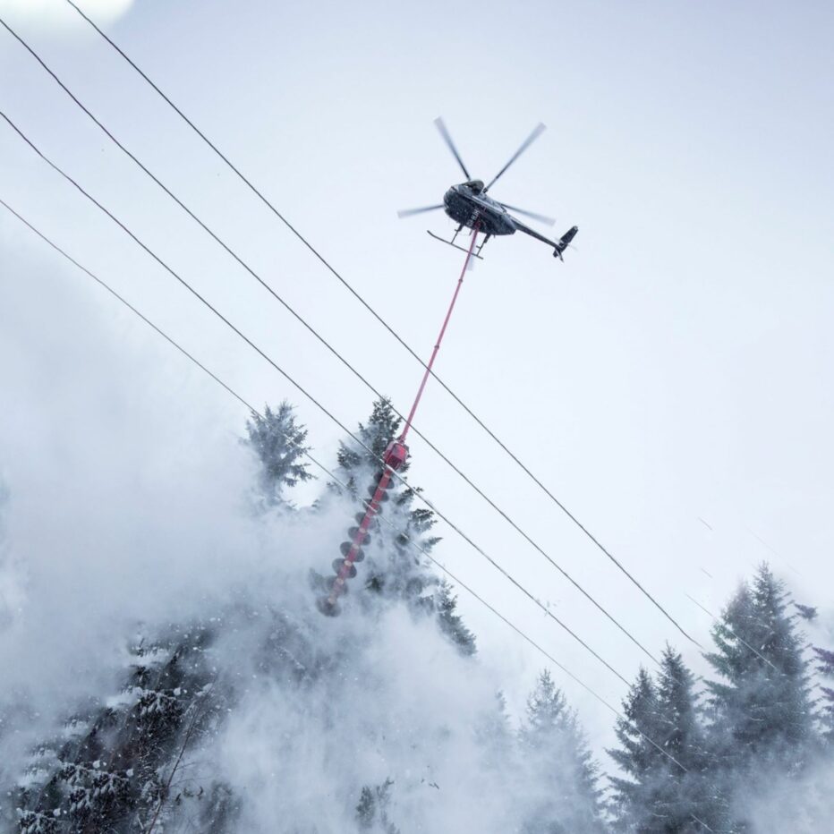 Heliwestin kopterilentäjät katkovat oksia ja puiden latvoja sähkölinjojen tieltä, jotta puut eivät pääse vahingoittamaan linjoja ja katkaisemaan sähköjä asutuskeskuksista.