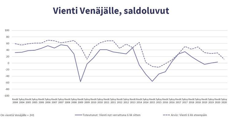 Venäjän-kaupan kevään 2020 barometritutkimukseen vastasi lähes 300 Venäjän-kaupan tekijää. Viennin kasvusta edellisen kuuden kuukauden aikana kertovien osuus jatkoi kasvuaan. Viennin supistumista seuraavan kuuden kuukauden aikana odottavien osuus on yli kaksinkertaistunut syksyn barometrista.