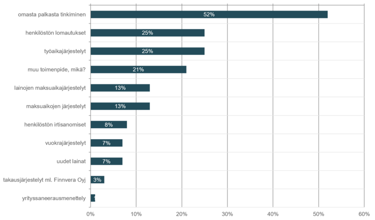 Pohjois-Pohjanmaan Yrittäjät teki elokuun alussa kyselyn jäsenyrittäjille koronakriisin vaikutuksista ja tulevaisuuden näkymistä oman liiketoiminnan suhteen. Yrityksissä suunnitellaan edelleen erilaisia sopeuttamistoimia tehtäväksi. Yrittäjistä 52% sopeuttaa tinkimällä omasta palkasta, 25% suunnittelee lomauttavansa henkilöstön ja saman verran tekevän erilaisia työaikajärjestelyjä. Maksuaikoja ja lainojen järjestelyjä otetaan myös tarvittaessa käyttöön. Henkilökuntaa ilmoittaa suunnittelevansa irtisanovan 8% vastaajista.