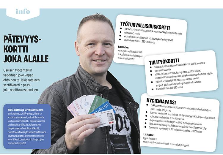 – Myös tulityökortti ja märkätilasertifikaatti ovat hyvin yleisiä. Muiden korttien tarve riippuu työtehtävästä.
