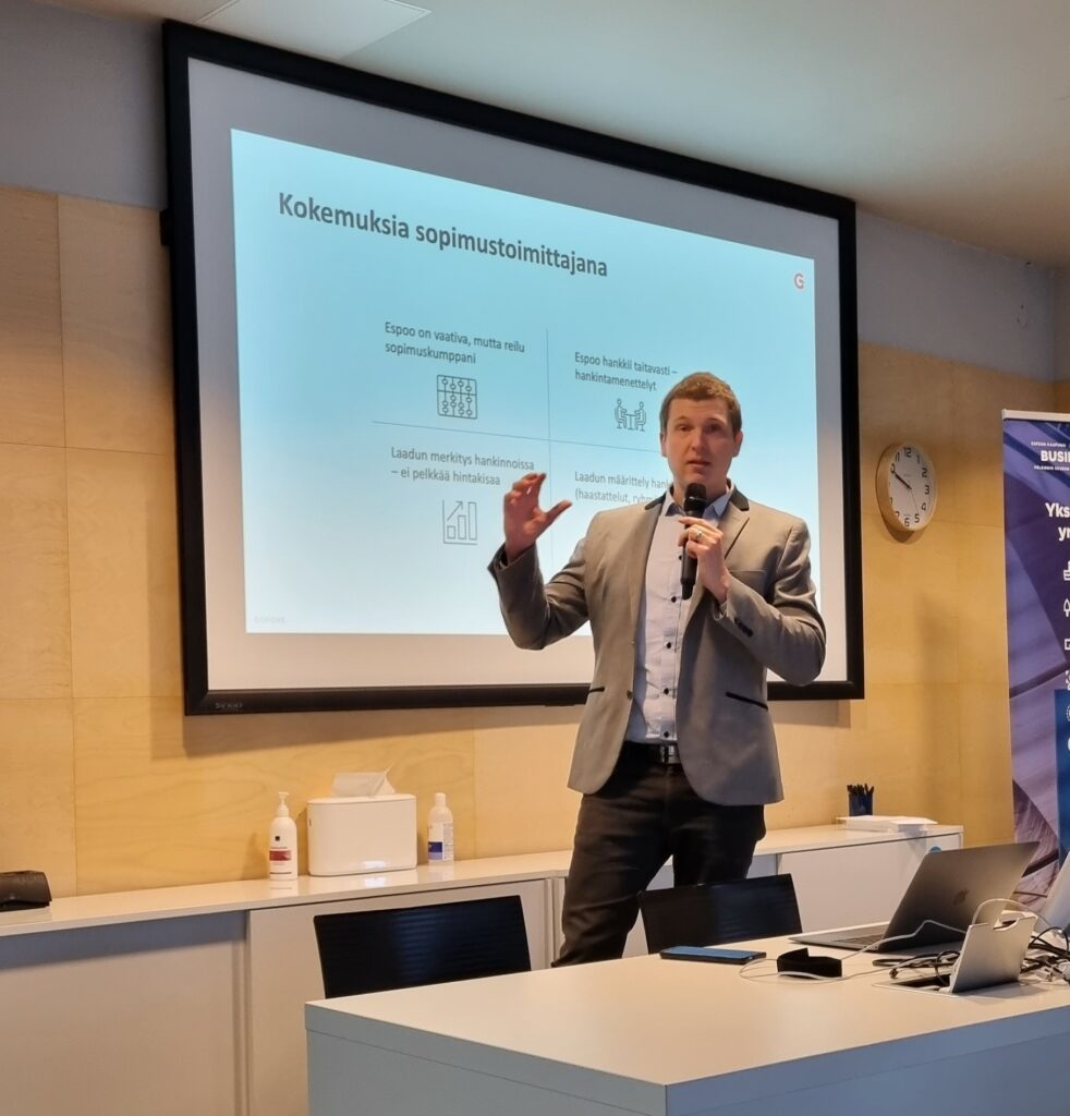 Espoossakin tunnistetaan tämä ja kaikissa kilpailutuksissa esimerkiksi markkinavuoropuhelu on pakollinen. Mikäli sitä ei järjestetä, siihen täytyy saada lupa hankintajohtaja Pihla Hynyseltä. Espoo kannustaa yrityksiä olemaan jo ennen kilpailutusta yhteydessä tuotteita ja palveluita käyttäviin yksiköihin. Hynynen valaisi tilaisuudessa kaupungin hankintojen kokoluokkaa, toimintatapoja ja kuinka sopimuksia uudistetaan. Espoo painottaa hankinnoissaan etupainotteisuutta, eli valmistelun tärkeyttä.