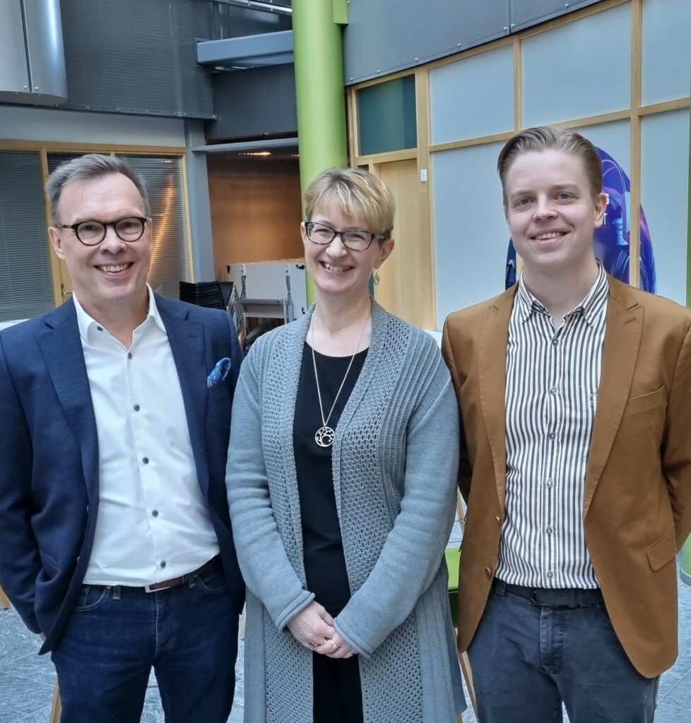 Business Espoon hankintaseminaarin juonsivat Espoon kaupungin yrityspalvelupäällikkö Riku Heino (kuvassa oikealla) ja Espoon Yrittäjien hankinta-asiamies Pentti Komssi. Keskellä asiantuntija Raija Kaljunen Laurea-ammattikorkeakoulusta.