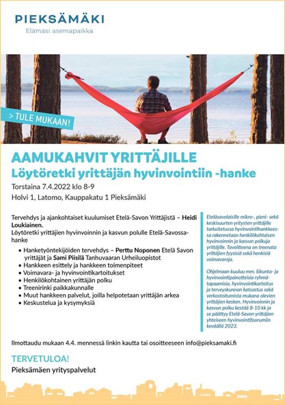 Nyt tärkeää asiaa tarjolla.Pieksämäen Yrityspalvelut järjestää aamukahvitilaisuuden Yrittäjien hyvinvointihankkeesta. Lue hankkeesta ja tilaisuudesta lisää .