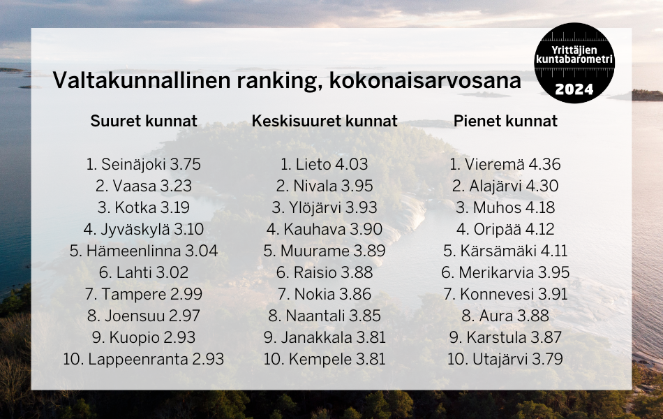 Taloustutkimus kysyi Suomen Yrittäjien toimeksiannosta yrittäjiltä mielipiteitä yrityksen kotikunnan toiminnasta eri osa-alueissa asteikolla 1–5. Tarkastelussa olivat kunnan päätöksenteon yrityslähtöisyys, hankinnat, yrityspalvelut, elinkeinopolitiikan asema kunnassa, infrastruktuuri, koulutus ja osaaminen, arvio kunnan elinkeinopolitiikasta, kunnan puoleensavetävyys, kunnan oman toiminnan avoimuus ja markkinoille meno, yritysvaikutusten arviointi, monipaikkaisuus ja ulkomaisen työvoiman saanti.