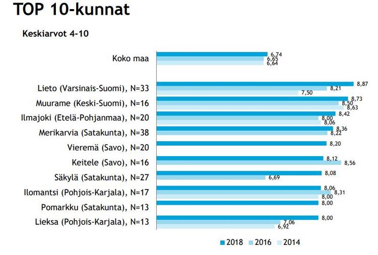 Kunnittain tarkasteltuna arvosanat vaihtelevat suuresti. Parhaan arvosanan vuonna 2018 saivat alle 10 000 asukkaan kunnista Muurame Keski-Suomesta (8,73), yli 10 000 asukkaan kunnista Lieto Varsinais-Suomesta (8,87) sekä suurista kaupungeista Seinäjoki (7,61).