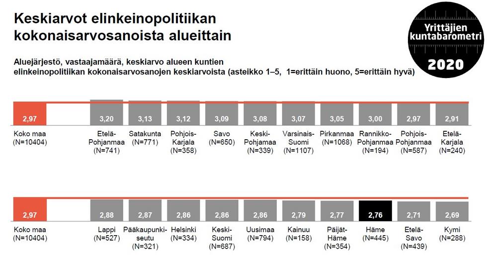 Yrittäjät arvioivat kantahämäläisen elinkeinopolitiikan Suomen kolmanneksi heikoimmaksi. Valtakunnallisille top-10 -listoille ei noussut tällä kertaa yksikään hämäläinen kunta, mutta positiivisia yllättäjiä löytyi useita.