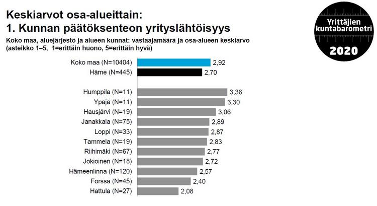 Yrittäjät arvioivat kantahämäläisen elinkeinopolitiikan Suomen kolmanneksi heikoimmaksi. Valtakunnallisille top-10 -listoille ei noussut tällä kertaa yksikään hämäläinen kunta, mutta positiivisia yllättäjiä löytyi useita.