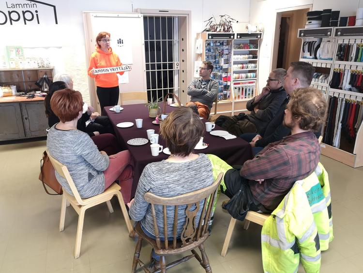 Aamukahvit kokosi kymmenkunta yrittäjää Lammin Kopille. Mukana oli myös Pauliina Hirviniemi, joka on kolmisen viikkoa sitten aloittanut työt Hämeen Yrittäjien palvelupäällikkönä.