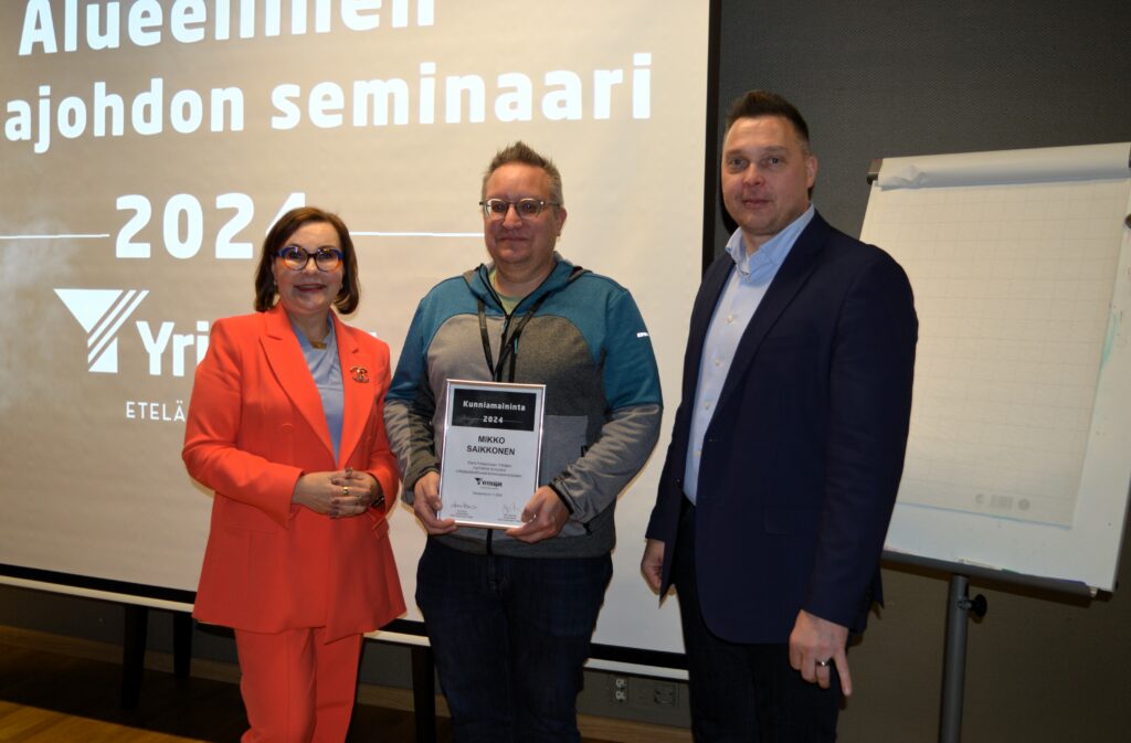Kunniamaininnalla palkittiin Etelä-Pohjanmaan hyvinvointialueen hankinta-asiantuntija Mikko Saikkonen yrittäjäystävällisestä toiminnasta työssään.