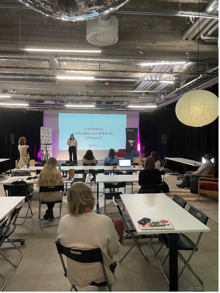 Tapahtumassa kouluttajana toimineen markkinointiammattilaisen Anna Kärävän puheenvuorossa pidin erityisesti hänen ajatuksestaan konkretisoida vastuullisuus ja välttää viherpesua. Onko viestilläsi oikeasti merkitystä vastuullisuuden kannalta, vai pyritkö vain hyödyntämään trendikästä teemaa brändi-imagosi parantamiseksi? Yrittäjien esimerkkipuheenvuorojen kautta tapahtumasta jäi mieleen myös monia käytännön esimerkkejä kuten se, että aidosti merkityksellinen ja henkilökohtainen vastuullisuus erottuu ja rakentaa luottamusta. Ihmiset tunnistavat helposti ”turhan” vastuullisuuden, joka tähtää vain brändin imagon kehittämiseen. Mieleeni jäi myös vanha tuttu sanonta ”Jos puu kaatuu metsässä, eikä kukaan ole sitä kuulemassa, kuuluuko siitä ääni?”, joka pätee myös vastuullisuusviestintään. On tärkeää miettiä, kenen kanssa tekee yhteistyötä, miten ja miksi, sekä säilyttää viesti aitona ja läpinäkyvänä. Silti viestinnässä on hyvä olla rohkea ja välttää liiallista murehtimista.
