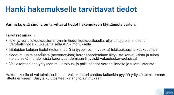 Yrityksen puolesta tukea hakevalla henkilöllä on oltava asiointivaltuutus. Hakemuksen voi täyttää nimenkirjoitusoikeuden omaava henkilö. Tämä henkilö voi valtuuttaa tuen hakemiseen myös toisen henkilön Suomi.fi -sivuston Valtuudet-palvelun kautta. Tunnistautuminen Valtiokonttorin hakupalveluun tehdään samaan tapaan kuin esimerkiksi verottajan palveluun.