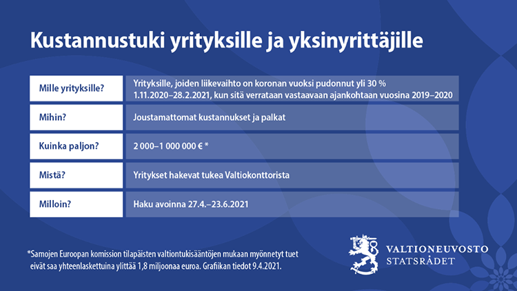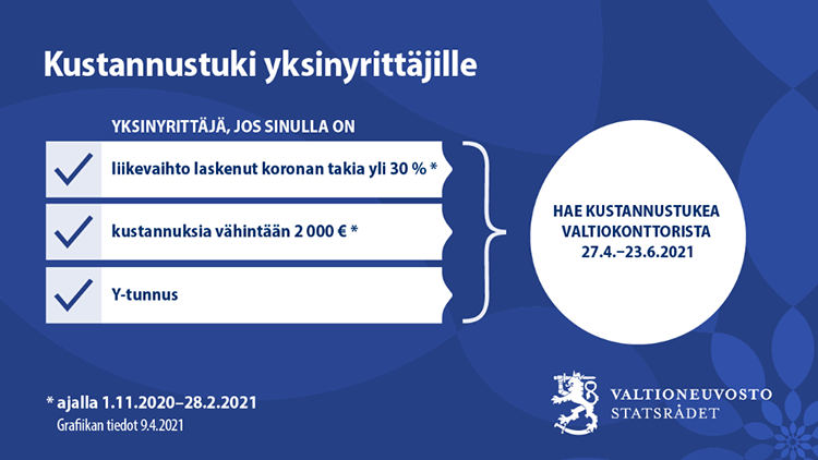 Kustannustuki on tarkoitettu yrityksille, joiden liikevaihto on laskenut yli 30 prosenttia koronaepidemian vuoksi tukikaudella 1.11.2020–28.2.2021, kun sitä verrataan pääsääntöisesti vastaavaan ajankohtaan vuosina 2019–2020.