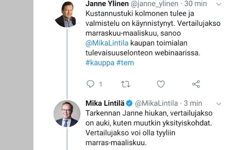 Elinkeinoministeri viittasi kustannustuen kolmanteen versioon kaupan tulevaisuusselonteon webinaarissa.