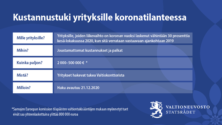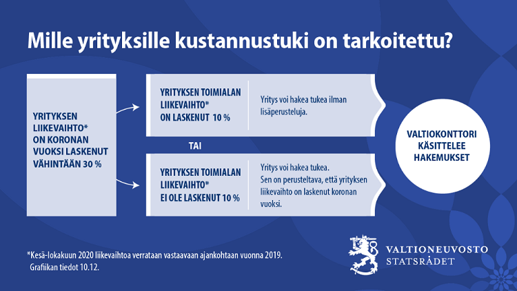 Haku alkaa maanantaina 21.joulukuuta ja päättyy 26. helmikuuta Tukea voi hakea kesä-lokakuun ajanjaksolta. Kriteerinä on, että liikevaihto on laskenut vähintään 30 prosenttia koronakriisin vaikutuksen seurauksena. Kustannustuki on tarkoitettu kaikille yrityksille, jotka täyttävät kriteerit.