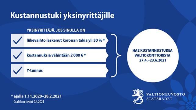 Kustannustuen kolmas hakukierros avautuu 27.4.2021. Yksinyrittäjät voivat saada vähintään 2 000 euron tuen. Suljetut yritykset voivat hakea myös kustannustukea 12.5.2021 alkaen.