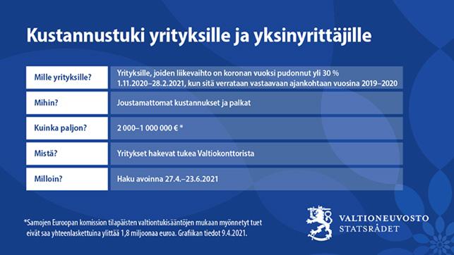 Kustannustuki on tarkoitettu yrityksille, joiden liikevaihto on laskenut yli 30 prosenttia koronaepidemian vuoksi tukikaudella 1.11.2020–28.2.2021, kun sitä verrataan pääsääntöisesti vastaavaan ajankohtaan vuosina 2019–2020. Kustannustuen haku on käynnissä 23.6.2021 saakka.