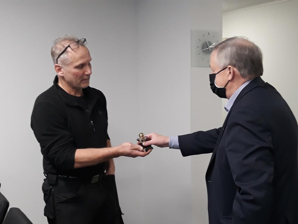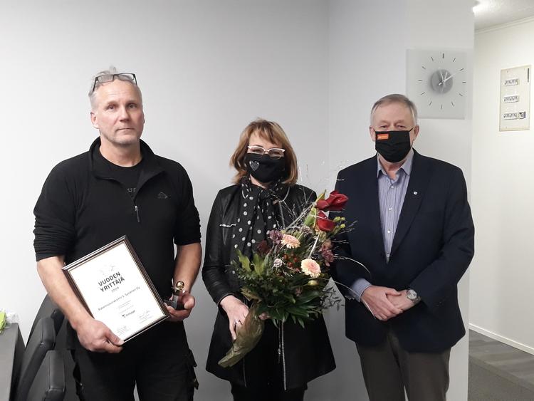 Kuusankosken Yrittäjät palkitsi lauantaina Vuoden Yrittäjän. Perinteinen juhla jäi tänä vuonna väliin koronan vuoksi. Kuusankosken Yrittäjien puheenjohtaja Aimo Rautiainen ja sihteeri Hannele Pylvänen veivät onnittelut henkilökohtaisesti perille.