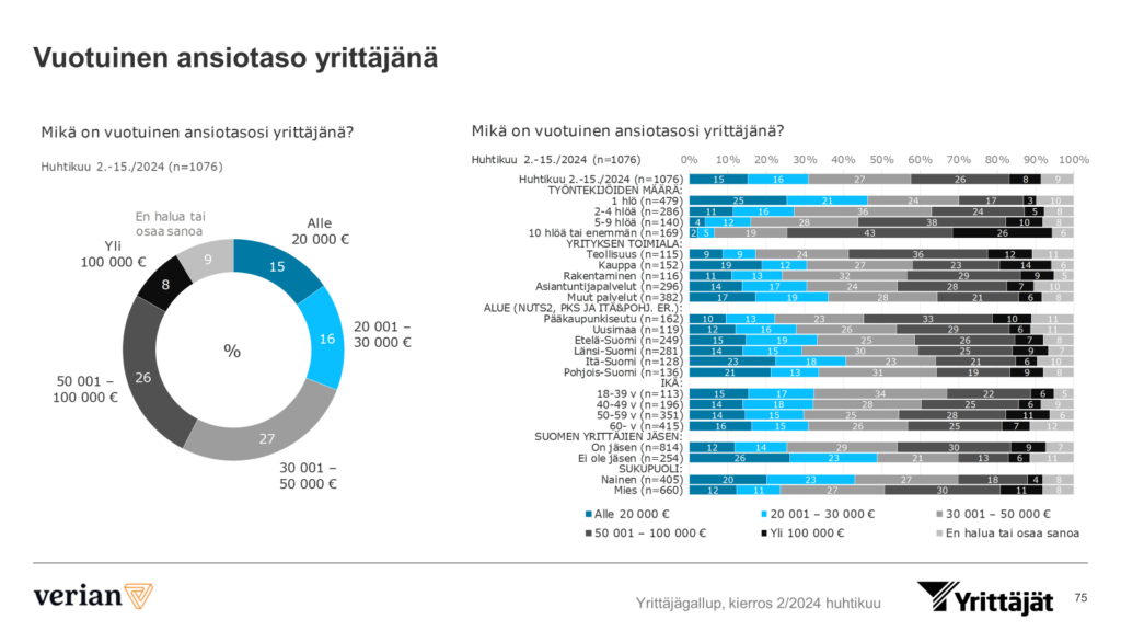 Tuoreen Yrittäjägallupin mukaan 58 prosenttia yrittäjistä ansaitsee vuodessa enintään 50 000 euroa. Kahdeksan prosenttia vastaajista yltää yli 100 000 euron vuosiansioihin.