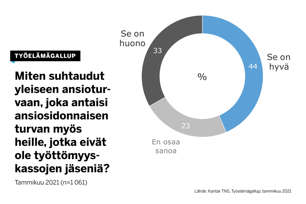 Työelämägallupin tulosten perusteella 44 prosenttia työllisistä pitää hyvänä yleistä ansioturvaa, joka antaisi ansiosidonnaisen turvan myös niille, jotka eivät ole työttömyyskassojen jäseniä. Kolmannes pitää ideaa huonona ja 23 prosenttia ei osaa arvioida ehdotusta.