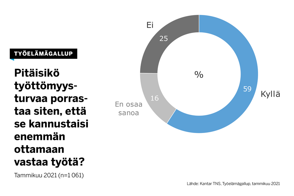 Tuoreen kyselyn mukaan 59 prosenttia työllisistä on sitä mieltä, että työttömyysturvaa pitää porrastaa niin, että se kannustaa vastaanottamaan työtä.