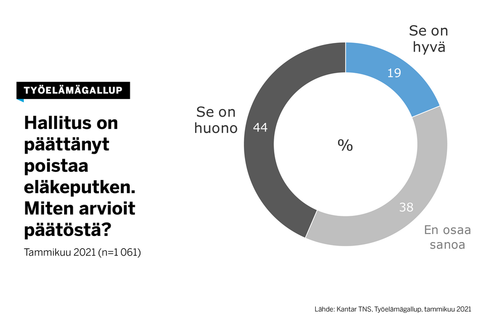 Päätöstä pitää kyselyyn vastanneiden mukaan hyvänä alle viidennes (19 %) ja huonona lähes puolet (44 %) työllisistä. Vastaajista 38 prosenttia vastaajista ei osaa arvioida hallituksen päätöstä puoleen tai toiseen.