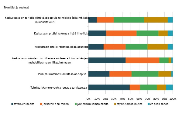 Kyselyn muita aihealueita olivat toimitilat ja niiden vuokrataso, keskustamiljöö, tapahtumat ja kaupunkitila sekä yhteistyö keskustan kehittämiseksi.
