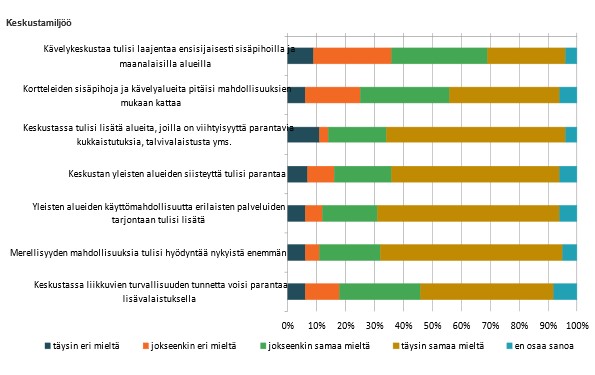 Keskustan miljöön parantamisessa yli 80 prosenttia vastaajista piti tärkeinä muun muassa keskustan viihtyisyyden, valaistuksen ja siisteyden lisäämistä sekä merellisyyden mahdollisuuksien hyödyntämistä nykyistä enemmän. Yleisten alueiden käyttömahdollisuutta erilaisten palveluiden tarjontaan tulisi myös lisätä.