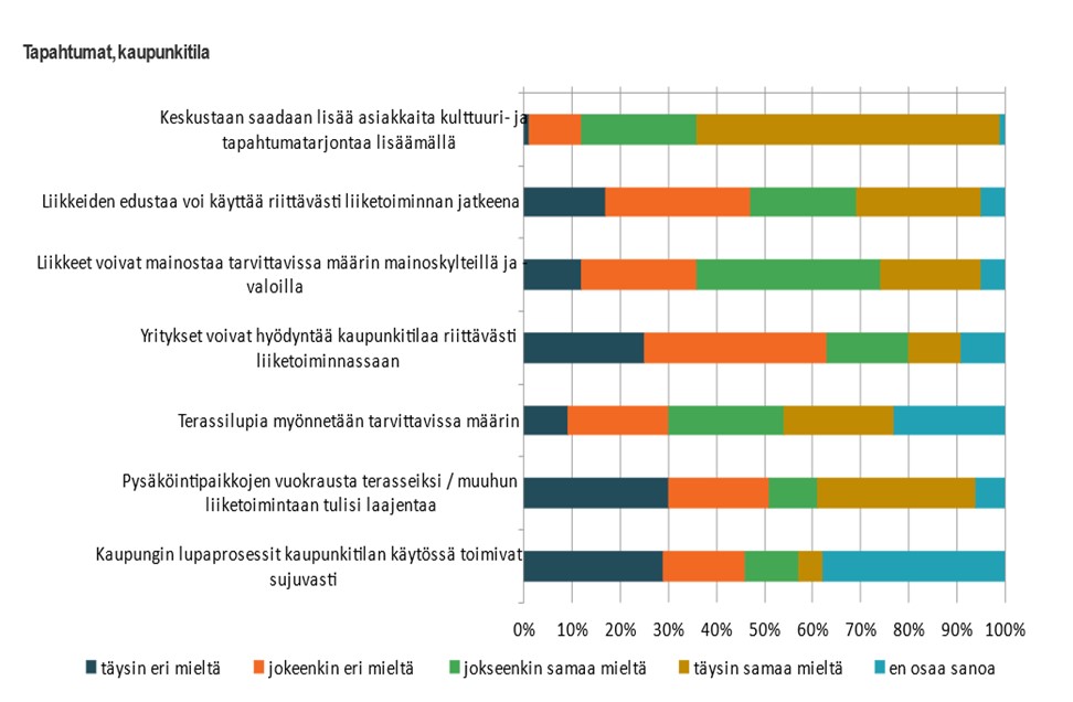 Yrittäjistä lähes 90 prosenttia pitää kulttuuri- ja tapahtumatarjonnan lisäämistä hyvänä keinona lisätä asiointia keskustassa. Myös avopalautteissa pidettiin tapahtumatarjontaa tärkeänä keskustan vetovoimalle. Yli 60 prosenttia vastaajista haluaisi hyödyntää kaupunkitilaa liiketoiminnassa nykyistä enemmän ja lupaprosesseihin toivottiin sujuvoittamista.