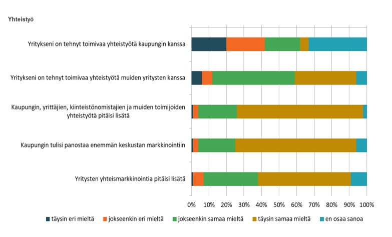 Kyselyyn vastanneista yli 80 prosenttia oli tehnyt toimivaa yhteistyötä muiden yritysten kanssa ja noin 20 prosenttia kaupungin kanssa.