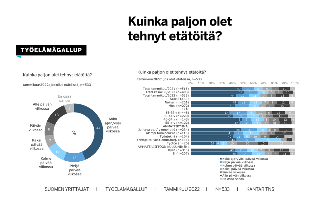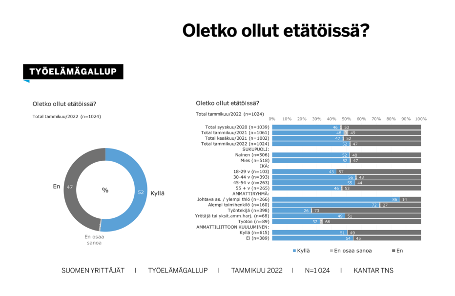Työllisistä 52 prosenttia on ollut etätöissä. Selvästi eniten, 86 prosenttia, etätöissä olleita on johtavassa asemassa toimivissa ja ylemmissä toimihenkilöissä, vähiten, 26 prosenttia, työntekijöissä.
