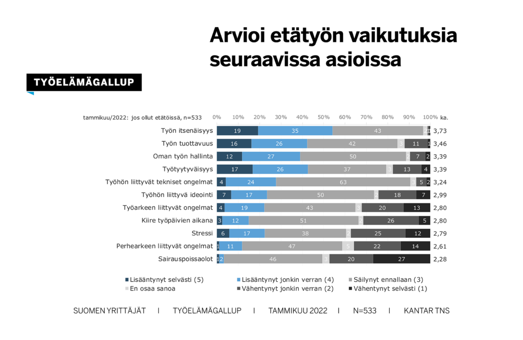 Etätöitä on opeteltu tekemään viimeiset kaksi vuotta. Suomen Yrittäjien Työelämägallupin tulosten mukaan etätyö on lisännyt työelämässä olevien mukaan työn itsenäisyyttä, työn tuottavuutta ja vähentänyt sairauspoissaoloja.
