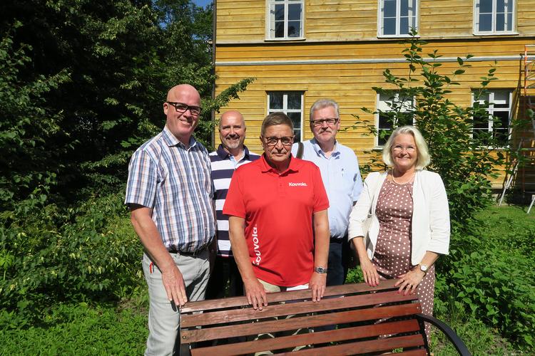 Markku Pakkasen johdolla (vas.) Jari Liikkanen, Harri Helminen, Hannu Lehtinen ja Saila Rosas keskustelivat yrittämisestä ja laajemmin elinvoimasta Kouvolassa ja Kymenlaaksossa 20.7. Anjalan kartanolla.