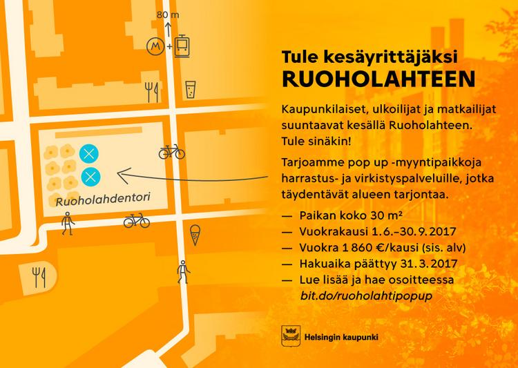 Kaupunkilaiset, ulkoilijat ja matkailijat suuntaavat kesällä Ruoholahteen. Tule sinäkin! Helsingin kaupunki tarjoaa Ruoholahdentorilla kaksi pop up -myyntipaikkaa kesän ajaksi harrastus- ja virkistyspalveluille, jotka täydentävät alueen tarjontaa.