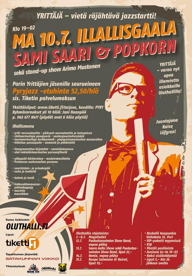 Rauman Yrittäjät ry:n jäsenille viihdepaketti maksaa 52,50e + kuljetus 20e. Tapahtuma on tänä vuonna Oluthallissa Valtakadulla. Esiintymässä ovat Sami Saari & Popkorn sekä stand-up show Arimo Mustonen.