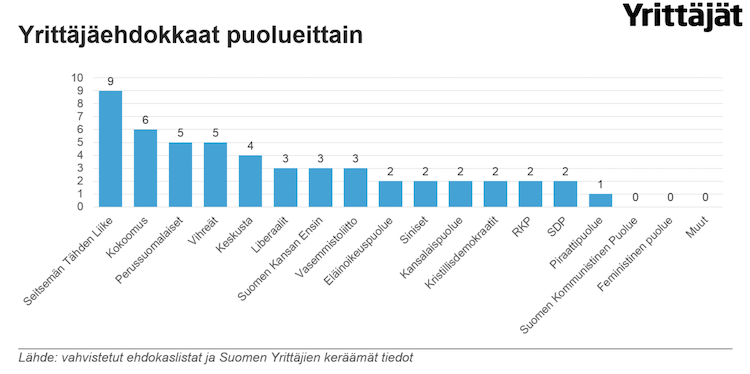 Ehkä hieman yllättäen eniten yrittäjäehdokkaita on Seitsemän Tähden Liikkeellä, jonka listoilla heitä on yhdeksän. Liikkeen kaikista ehdokkaista 45 prosenttia on yrittäjätaustaisia.